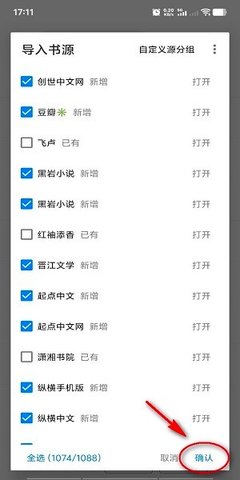 最后,勾选需要的书源,默认是全选,点击右下角的“确认”,书源就导入成功了。