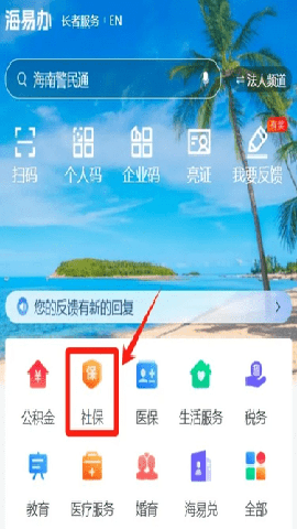 进入海易办APP或海易办支付宝、微信小程序,点击首页【社保】。