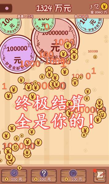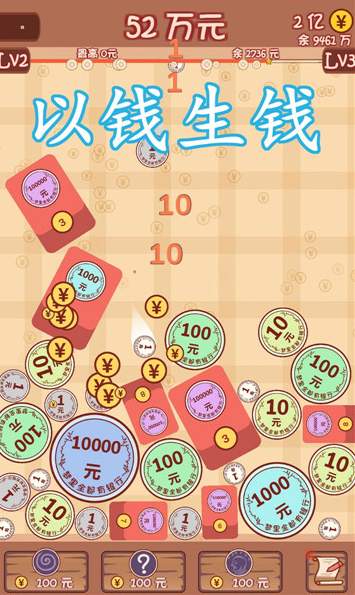 合成一个亿手机版:相同的小金币凑一块就能合成升级的,而且会越合越大呢,看着数字往上涨挺带劲的,操作只需要一个手指一点就能扔金币,但得算好位置,不然容易卡住,记得要把远处的金币挤到一块,前期随便放都行,后期就得留好空位,别让大金币堵住路了。