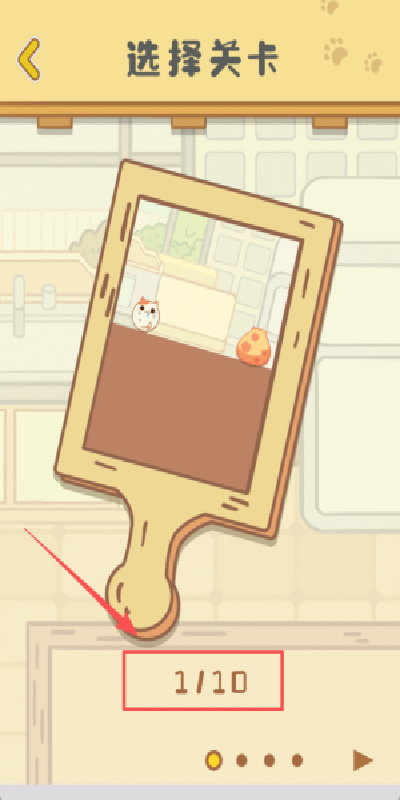 2、看到选择关卡界面后,点一下中间那个红色框标着1/10的木铲图案,就能选第一关开始挑战。
