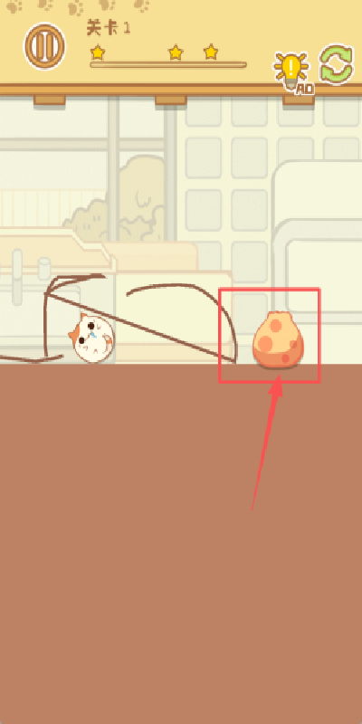 3、进入关卡1后,用手指从左边小猫位置画一条线,绕过棕色障碍连到右边食物上,让猫顺着线吃到食物。