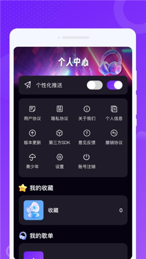 3、进入个人中心,可开启个性化推荐、启用青少年模式,还能便捷查看并管理收藏的音乐内容。