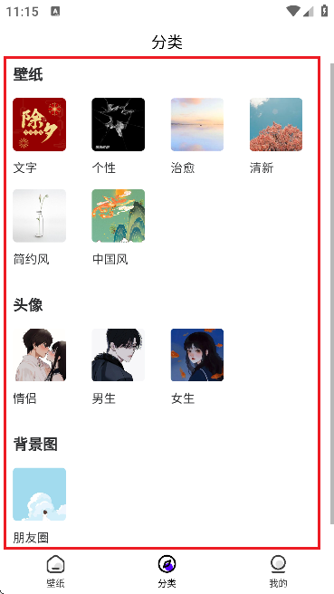 4、点击分类入口,可自由切换头像、壁纸、朋友圈背景图等不同类型的图片资源。
