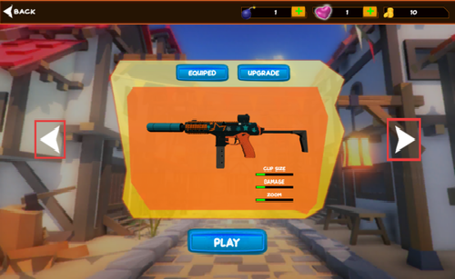 2、在武器选择页,点击左右箭头,切换查看不同武器,选好后点PLAY参战。