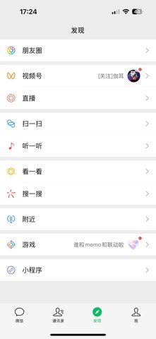 进入“发现”页面:打开微信App,在底部菜单栏点击“发现”。