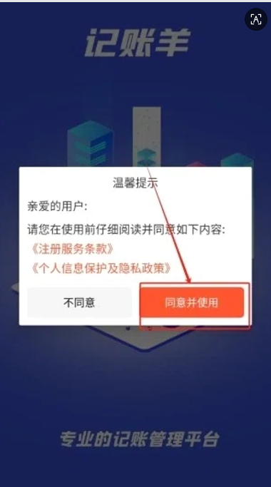 1、打开记账羊软件后,点击“同意并使用”,即可进入软件主界面开始操作。