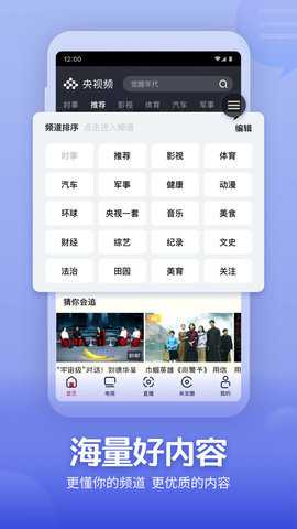 3、央视频聚合了《动物世界》《天下足球》《航拍中国》《舌尖》等数不胜数的新老热播节目,也汇聚了央视及各地方卫视三十余个频道的电视节目直播,更有丰富的赛事和热点事件的实况报道。
