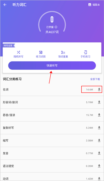 2、在快速听写之前需要先下载单词语音包,在下方下载你想要听写的内容。