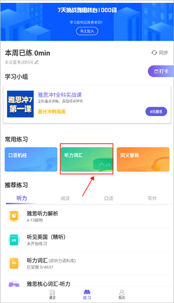 1、首先我们打开app,在练习界面找到“听力词汇”。