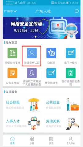 1、安装APP应用程序,进入广东人社主页,点击“待遇资格认证”图标。