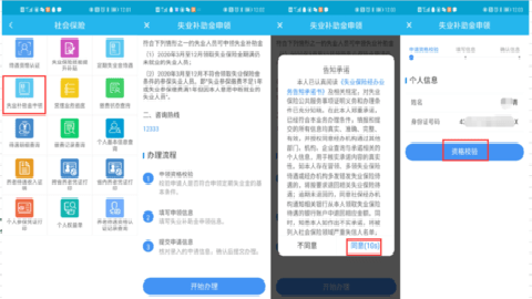 2.登录后进入失业补助金申领页面,点击“开始办理”按钮;阅读告知承诺内容后,点击“同意”进入资格检验,系统完成资格校验后填写相关信息并提交完成申报。如下图所示: