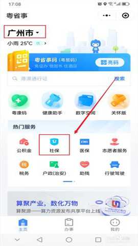 第一步,打开广东人社app,城市地点选择【广州市】,在热门服务栏目选择【社保】。