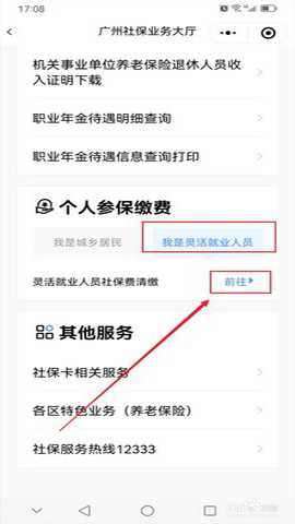 第二步,选择个人参保缴费栏目,点击【我是灵活就业人员】,然后选择灵活就业人员社保费清缴项目,点击【前往】。