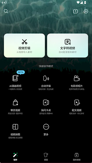 1、创作界面提供全能创作工具,包括AI漫画视频、自动字幕等