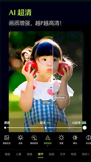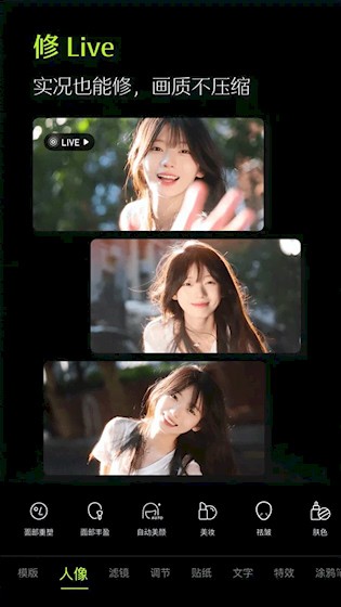 1、 质感肤质一键美颜:一键操作即可获得高级质感肤质,自然细腻不假白,轻松修出好肤色效果。