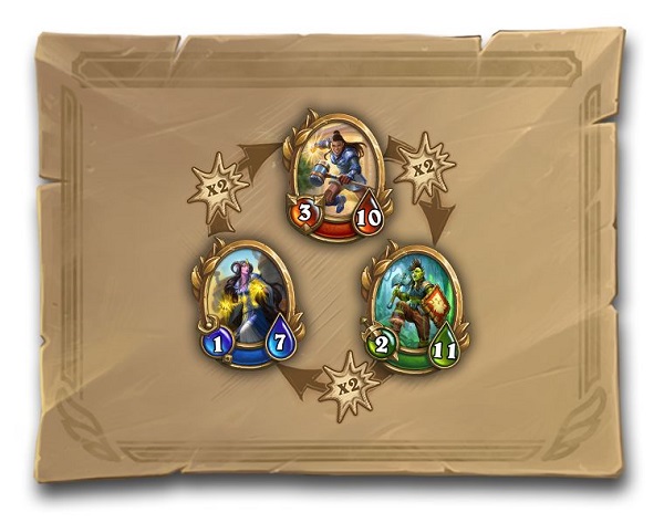 在这个模式里,不同职业间是存在双倍伤害的克制关系的,红色护卫克制绿色斗士,绿色斗士克制蓝色施法者,蓝色施法者克制红色护卫,这种克制存在于所有的技能当中,即不管绿色施法者是用物理技能还是法术技能,都可以对红色护卫造成双倍伤害。