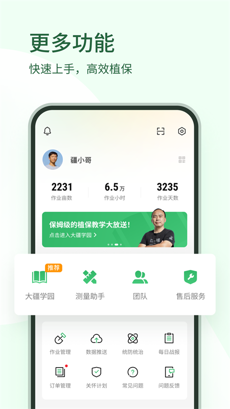 农场主可利用该应用自行规划喷洒任务,监控作业进度,实现精细化田间管理,降低对外部服务的依赖。3、农机合作社运营