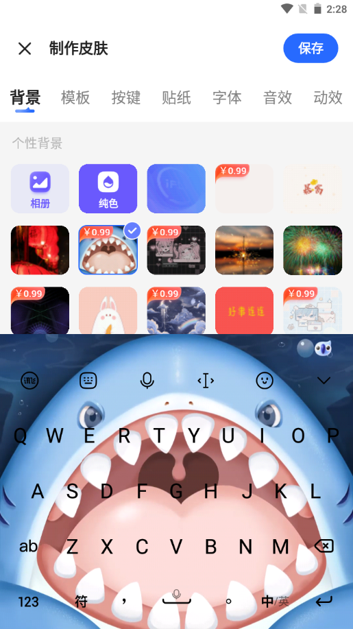 3.在这里自定义皮肤,可以从相册选择背景。制作完成后点击保存即可。