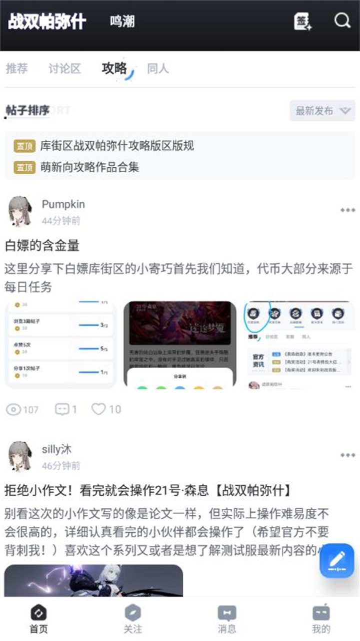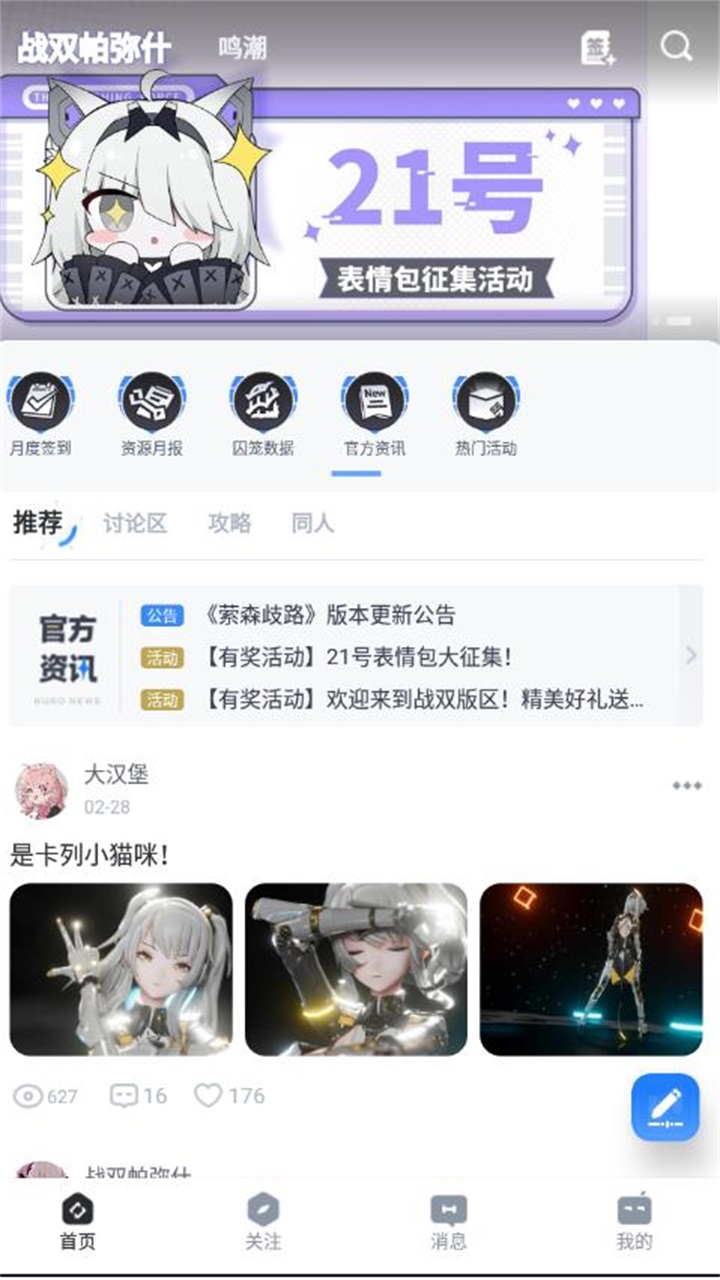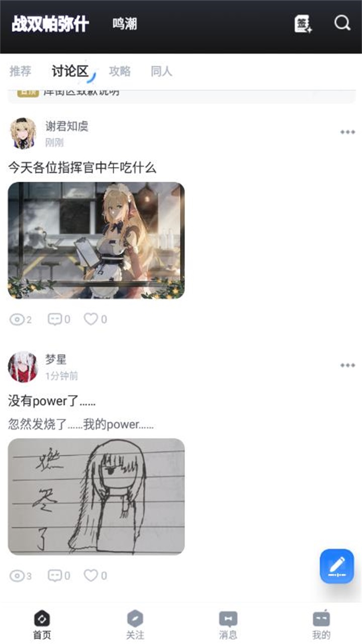 3、用户可以在社区内交流创作,分享游戏体验、玩法心得以及其他动态,比如创作一些同人插画、漫画或者同人文进行分享。发布帖子的格式很自由,可以是图文或者纯文,甚至是表情包(APP内已准备了大量的表情包素材),可以直接使用。