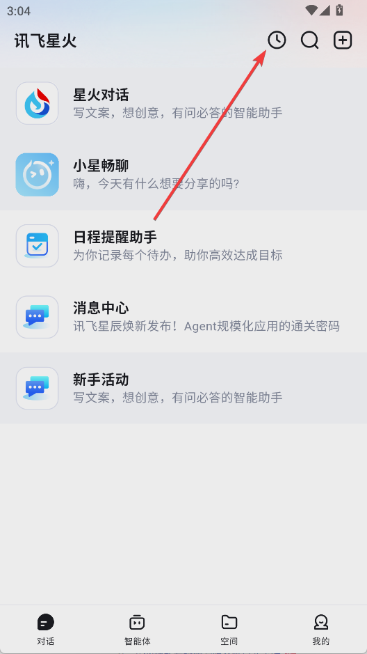 1、打开讯飞星火app,点击上方的时钟按钮
