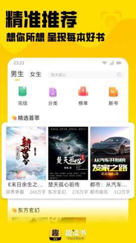 3、无论你喜欢都市、言情、仙侠、玄幻、悬疑、穿越重生等哪种题材的小说,趣读书都能为你优选海量畅销、好评的书籍,涵盖了所有分类,让精彩触手可得。