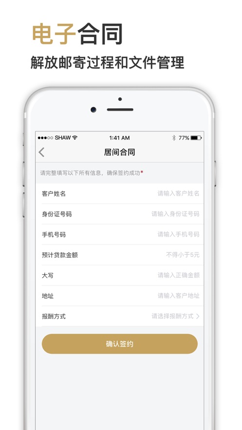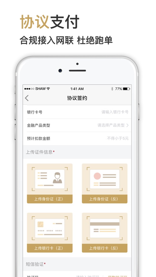 APP随时随地移动录入订单,接入银行存管,合法合规;支持四要素验证,客户授权完成在线划扣,支持分期。