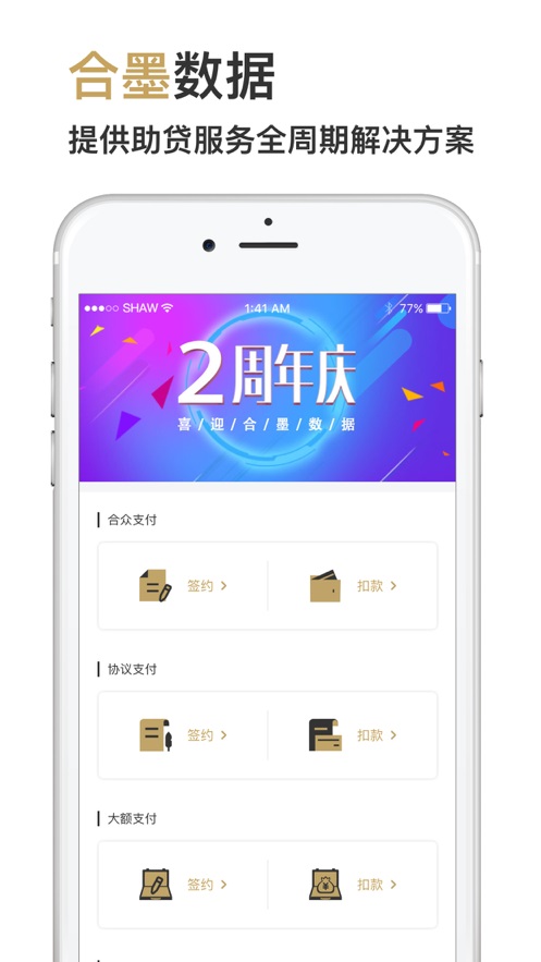 合墨数据APP是一个专门服务于商户们的实用管控软件,让商户们更高效的完成业务,签订合同,实现客户更高效的公司发展,包含多种场景,可以线上签订合同不需要邮寄或者出差,有司法的认可,保障安全。