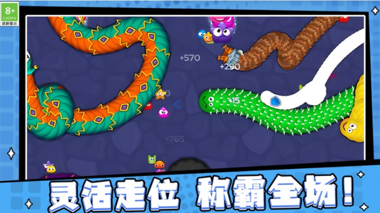 欢乐蛇蛇打砖块游戏是一款趣味盎然的休闲竞技游戏,玩家能够操控灵动小蛇开启冒险,在地图中寻觅食物,每一次进食都能让小蛇变长,你需要时刻留意边界,巧妙走位躲开其他小蛇的突袭,凭借敏捷操作和精准预判,冲击更高分数!