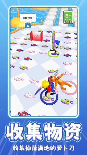 玩家将与其他竞争者展开激烈比拼,争夺并利用萝卜刀搭建桥梁,顺利通过关卡障碍。