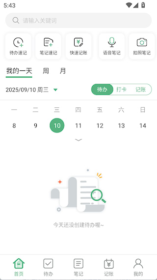 1、首页上方提供了各种功能的快捷入口,中间部分能按日期和类别筛选内容