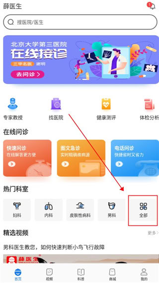 2、进入首页,点击「热门科室」右侧的「全部」按钮