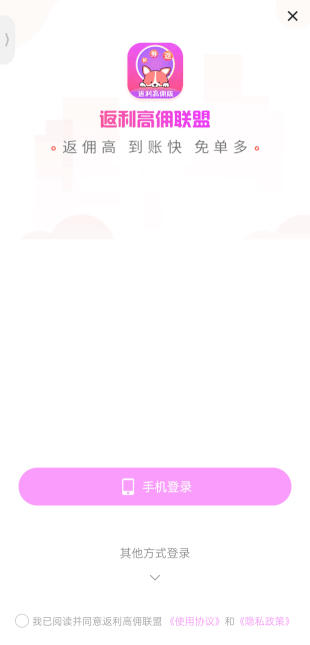 1、下载并安装返利高佣联盟APP,打开后阅读相关协议,自主选择是否同意协议内容。