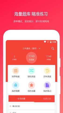 3、除了提供丰富的试题内容外,公共基础真题应用还具有多种功能,如随机测试、专项练习、模拟考试、错题记录等。