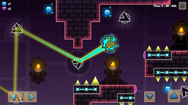 2、动态视觉呈现:障碍物随节奏产生缩放旋转效果,荧光几何体在暗背景中高速移动,色彩对比强烈增强动态追踪清晰度。