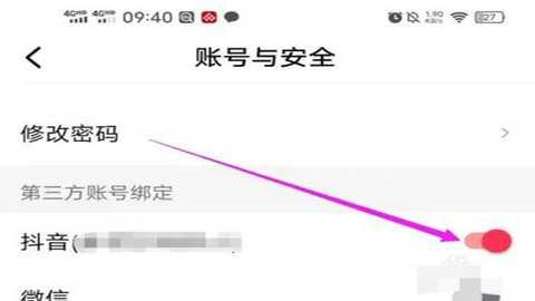 在“账号与安全”窗口中,点击“第三方账号绑定”板块下的【抖音】项后的开关图标。