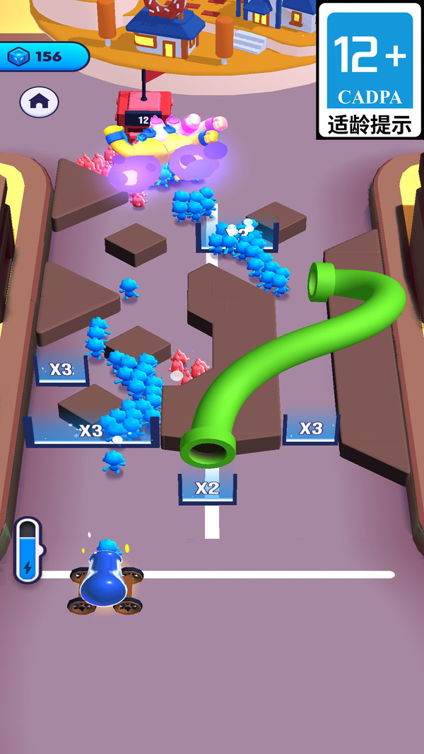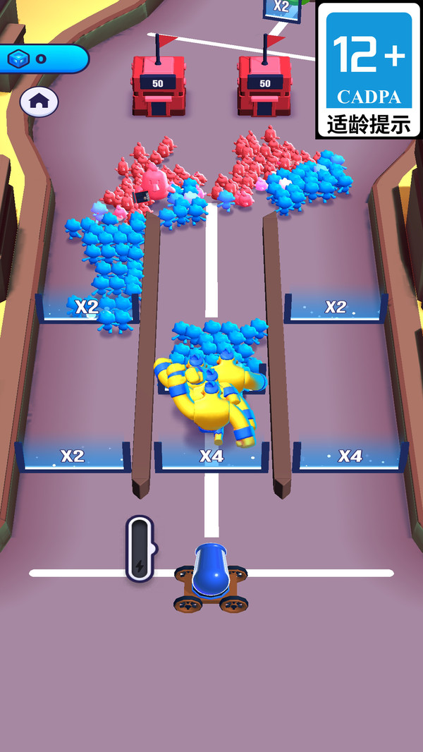 2、游戏中玩家通过点击屏幕发射士兵,控制他们躲避障碍,收集资源;