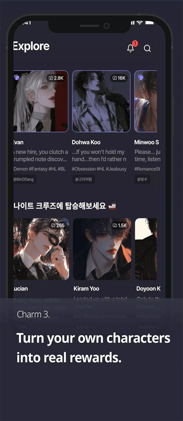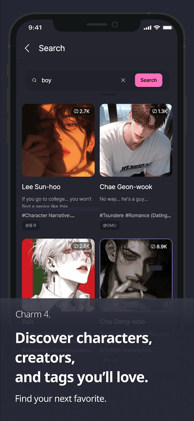 4.内容探索与筛选:设有“推荐”“精选”“热门”“游戏群聊”“男性/女性”“动漫”等分类标签,方便用户快速找到感兴趣的AI角色或内容。