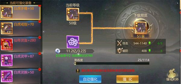 消耗银币即可进行强化装备,阶级越高的装备可强化的层数越高