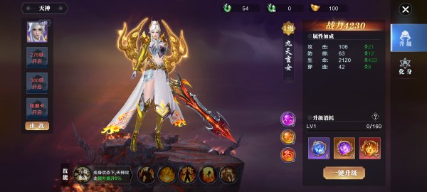 使用天神精魄可以增加天神经验值,经验值满后天神升级天神升级到指定等级可以解锁新技能,天神解锁后,可通过天神技能书提升技能效果。神力是珍贵的天神提升道具,其中启示之力还能百分比加成天神系统的总属性。另外,天神变身策略性较强,默认不自动变身,但可在设置中勾选自动变身天神。