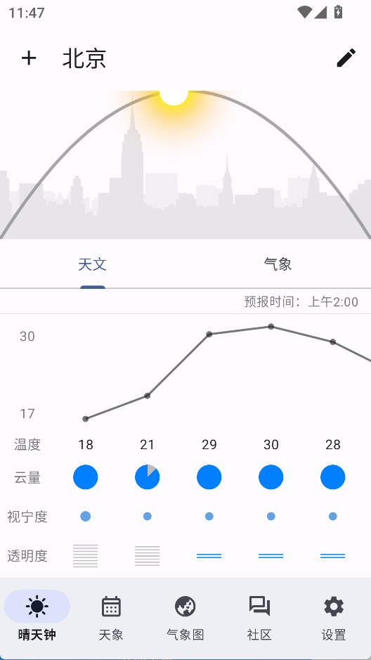 晴天钟是一款天气天文相关应用,它能把一天里不同时间的天气情况都讲清楚,气温高低、空气湿度这些日常要用的气象数据都给得很全,看一眼就能明白接下来天气怎么变,心里有底。会给出专门的天文观测相关数据,比如准确的天文晨光出现时间,方便喜欢看星星、拍星空的人做好准备,不管是出门办事、安排活动还是夜晚观测天象,都能提前规划,不用再担心天气和时间对不上,日常安排和兴趣探索都能更顺手。