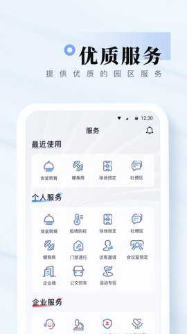 1、发布园区最新资讯、公告及各类政策,支持在线预订球场、健身房、会议室等等。