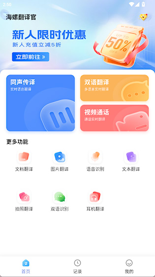 1、首页提供同声传译、视频通话等翻译工具