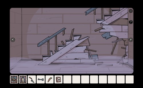 11、点击道具栏的画框切换世界,回到现实后到楼梯间的楼梯那里根据符号密码打开阁楼门板上的红色钥匙,接着进入阁楼进行搜索拿到「骰子」和「油壶」。