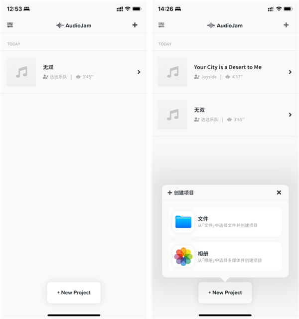 2、首先打开 App,点击「+」创建项目,此时需从「文件」导入音频文件,支持.mp3、.m4a、.aac、.aiff、.wav 格式音频及.mp4、.mov 格式视频。选择导入后会生成工程项目,可看到音频文件已导入,且在播放控制页面能看到对应波形。