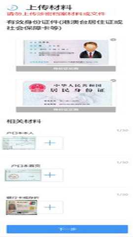 点击“+”按钮,可通过“拍照”或“从相册选择”方式上传材料,材料上传完毕,点击【下一步】按钮