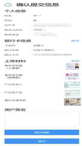 确认填写信息,如需修改则点击【修改】按钮,跳转“填写银行卡信息页面”、或“上传资料页面”,确认信息无误,点击【确认提交】按钮提交