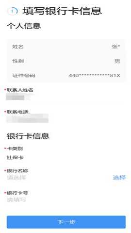 填写联系人姓名、联系电话、卡类别、银行名称、银行卡号信息(应使用社保卡),点击【下一步】按钮