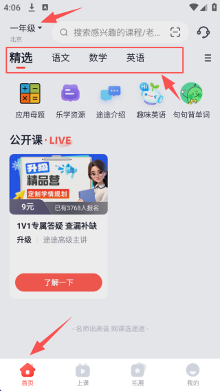 1、进入APP后,选择好孩子的年级,在首页可以看到当前年级语文、数学等科目的学习课程浏览。