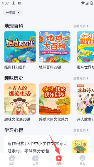 3、在“拓展”栏中,app会根据孩子年级进行课外知识拓展,浏览提升孩子各方面学习能力兴趣。