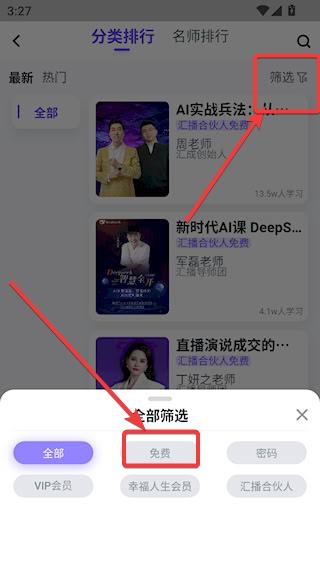 4、点击右上角【筛选】,可以筛选符合自己要求的课程(以免费为例)